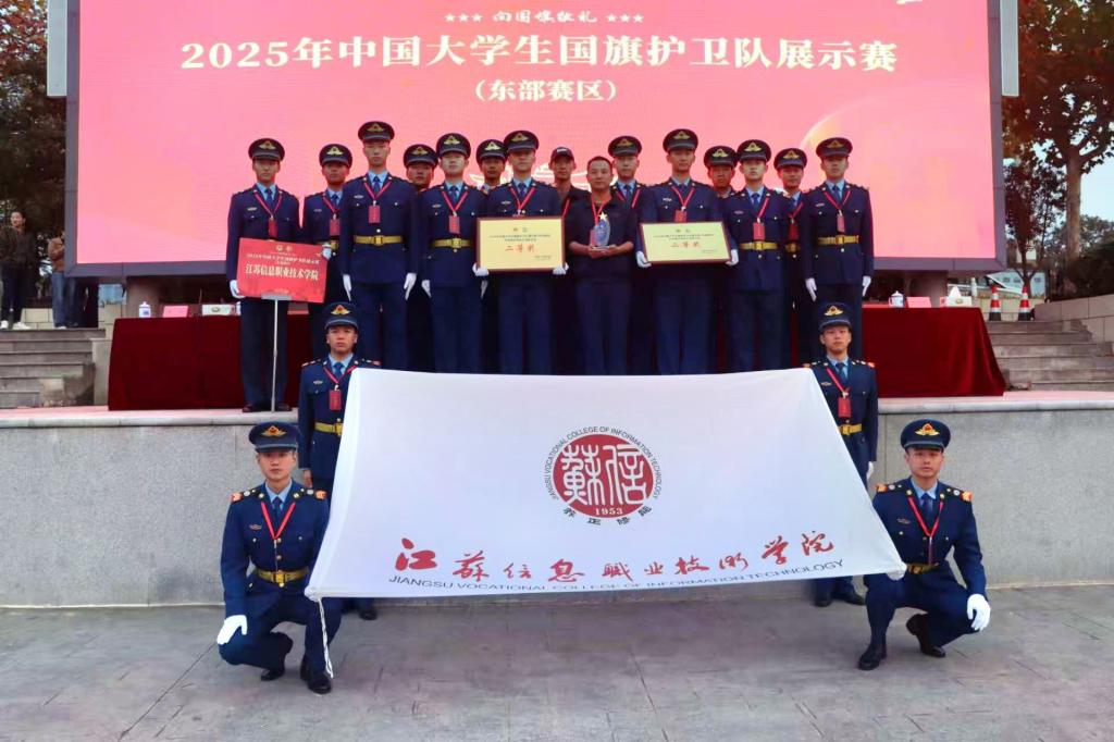 11月13日至17日,由中宣部宣传教育局(全民国防教育局)、教育部思想政治工作司联合指导,中国学生体育联合会主办的2025年中国大学生国旗护卫队展示赛(东部赛区)在江苏宿迁圆满落幕。我校国旗护卫队获男子乙组队列展示赛二等奖、升旗展示赛二等奖,以总分第三名的佳绩成功晋级全国总决赛;队员陈凯华、王博、陈睿、崔天佑四名同学获评“道德风尚奖”。