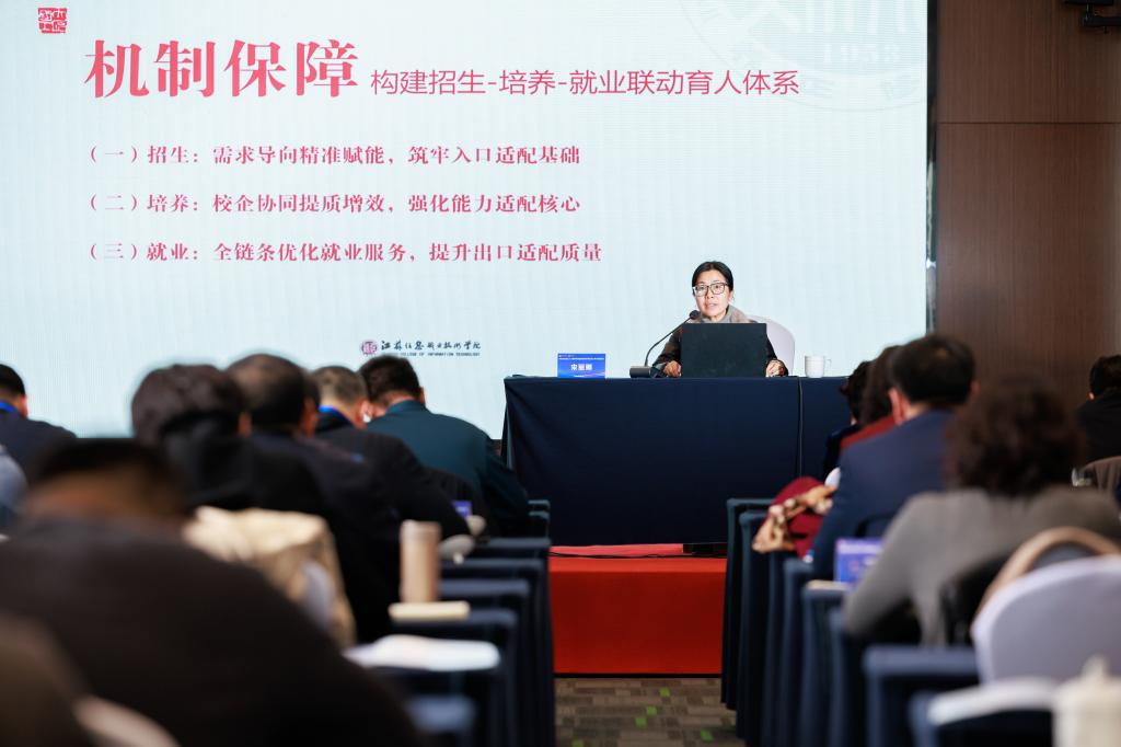会上,宋丽娜副校长作了题为《四维联动聚合力 产教融合促适配》的典型发言,系统呈现了学校在深化人才培养改革方面的创新实践与显著成效。宋丽娜副校长围绕服务区域电子信息产业发展,重点介绍了以“四维联动”为核心的产教融合新机制:构建全链条育人体系,实现人才精准供给;创新协同育人模式,打通产教融合路径;育人成效显著,形成可推广的“苏信方案”。