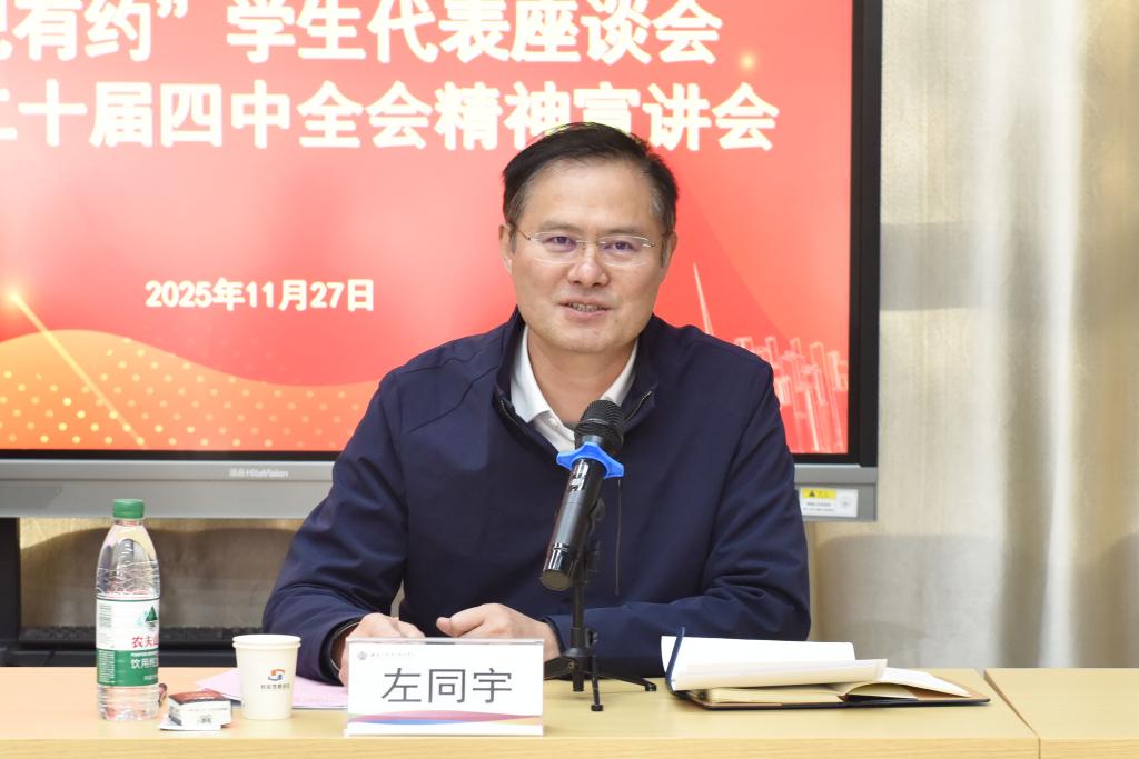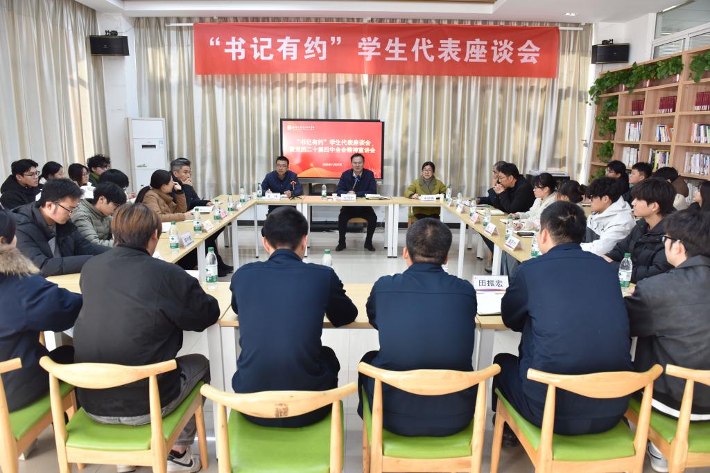 11月27日,学校举办党的二十届四中全会精神宣讲会暨“书记有约”学生代表座谈会。校党委书记左同宇、副校长宋丽娜出席会议。