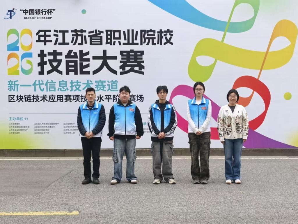4月18日至21日,2026年江苏省职业院校技能大赛区块链技术应用赛项在我校成功举办。来自全省54支参赛队(学生组38队、教师组16队)共130名选手同场竞技。最终,由我校物联网工程学院(信息安全学院)管维红、阮文飞老师指导的曹洪波、陈旭冉、沙建国荣获学生组一等奖第一名,阮文飞老师获教师组一等奖。